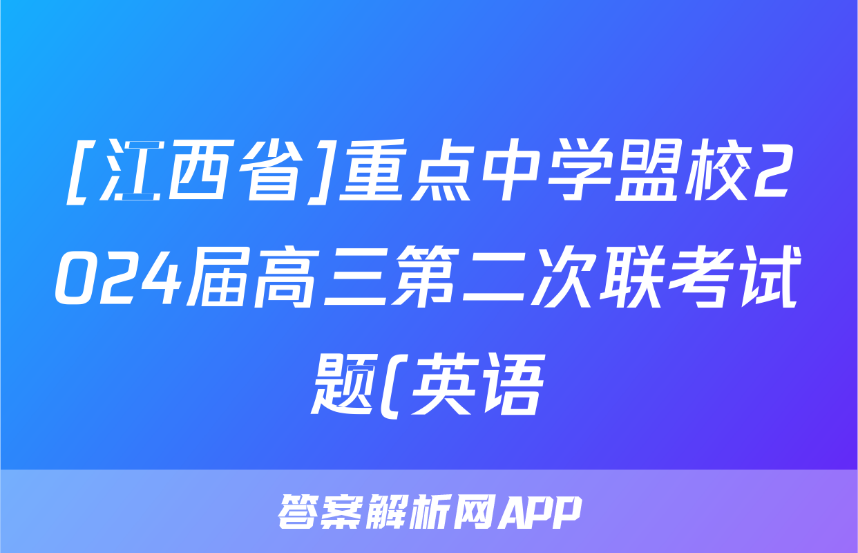[江西省]重点中学盟校2024届高三第二次联考试题(英语)正在持续更新,目前大联考答案为大家整理了相关试题及答案,供大家查缺补漏,高效提升成绩。
