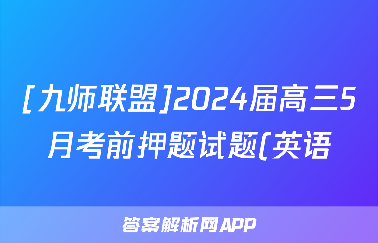 [九师联盟]2024届高三5月考前押题试题(英语)正在持续更新,目前大联考答案为大家整理了相关试题及答案,供大家查缺补漏,高效提升成绩。